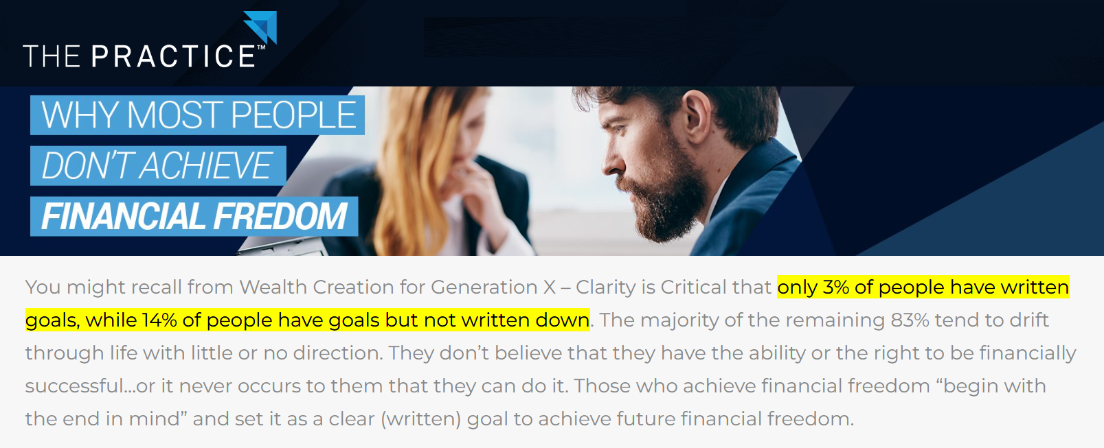 А ще, більша частка людей узагалі не ставить жодних фінансових цілей. Згідно статистики, тільки 3% людей мають записані цілі, і ще 14% – мають, але так, в голові (це напіврішення). І проблема тут у тому, що якраз ті 83%, що не мають цілей є найбільш вразливими до проблем і ризиків інвестування.
