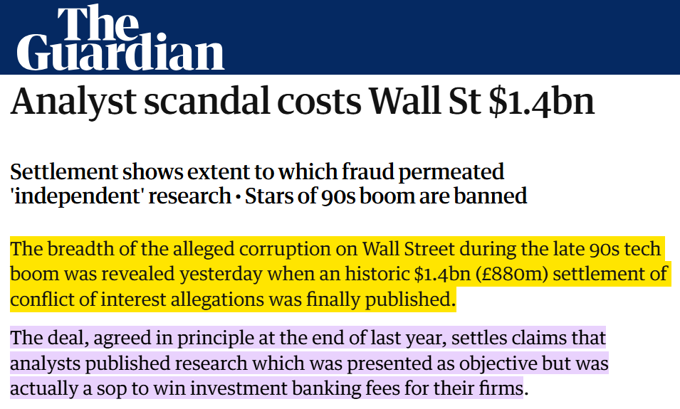 Один із прикладів, коли схему викрили і оштрафували інвестбанки, був під час бульбашки доткомів. Аналітики видавали за “незалежні” об’єктивні рекомендації та висновки, які були вигідні їхнім банкам для отримання комісій.