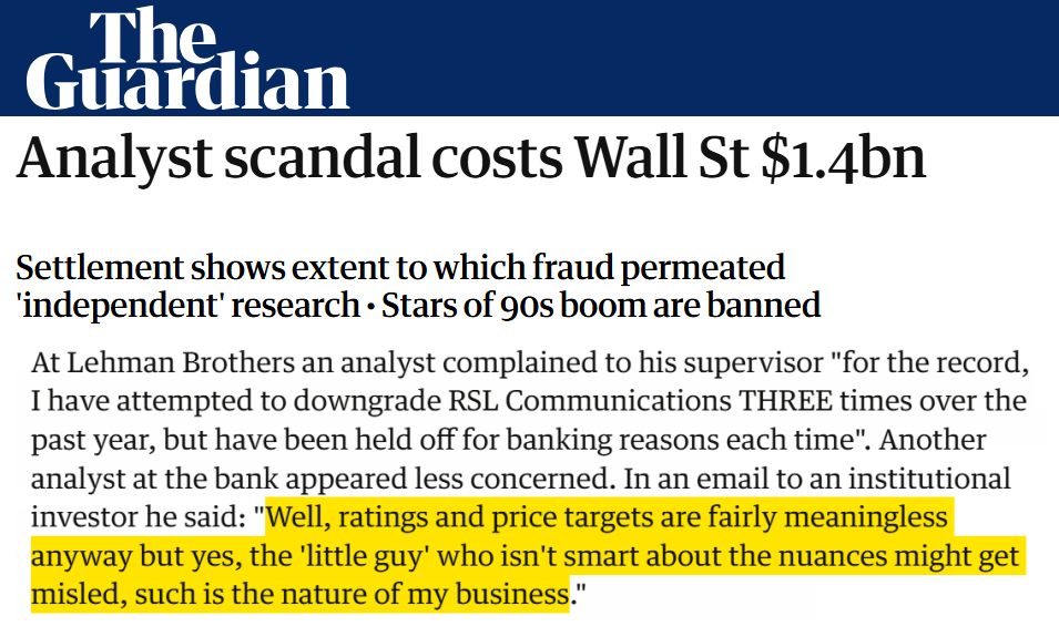 А буває ще гірше, коли аналітики працюють проти своєї аудиторії. І таких випадків є нажаль досить багато. При чому, цю схему використовують на тільки якісь маленькі шахрайські компанії, але і цілком престижні великі інвестиційні банки.