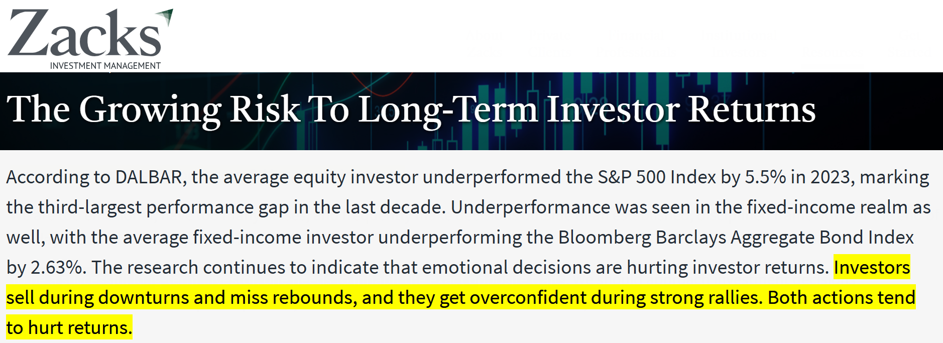 Дослідження Dalbar та інших організацій десятиліттями фіксують один факт: середньостатистичний інвестор стабільно недоотримує прибуток ринку саме через емоційні помилки – купівлю і продаж у невідповідний час. І це відбувається через те, що інвестори продають під час активного падіння ринку, або ж навпаки – від покупок під час ринкового ралі.