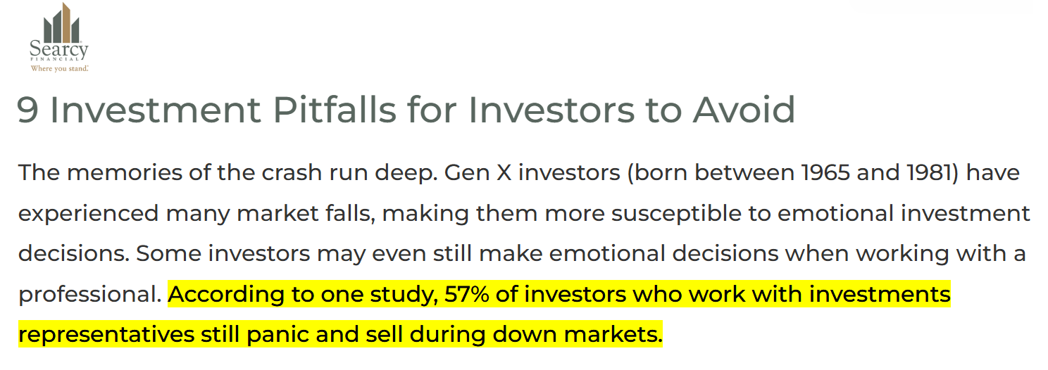 Проте, більшість інвесторів вважає, що це його не стосується. Така поведінка є реальною проблемою. Справа у тому, що навіть ті, хто користується послугами фінансових радників, не застраховані від паніки: дослідження показує, що 57% інвесторів все одно впадають в паніку і розпродаються при ринкових спадах. Тому, не потрібно дивуватися великим просадкам фондових ринків чи інших надійних активів.