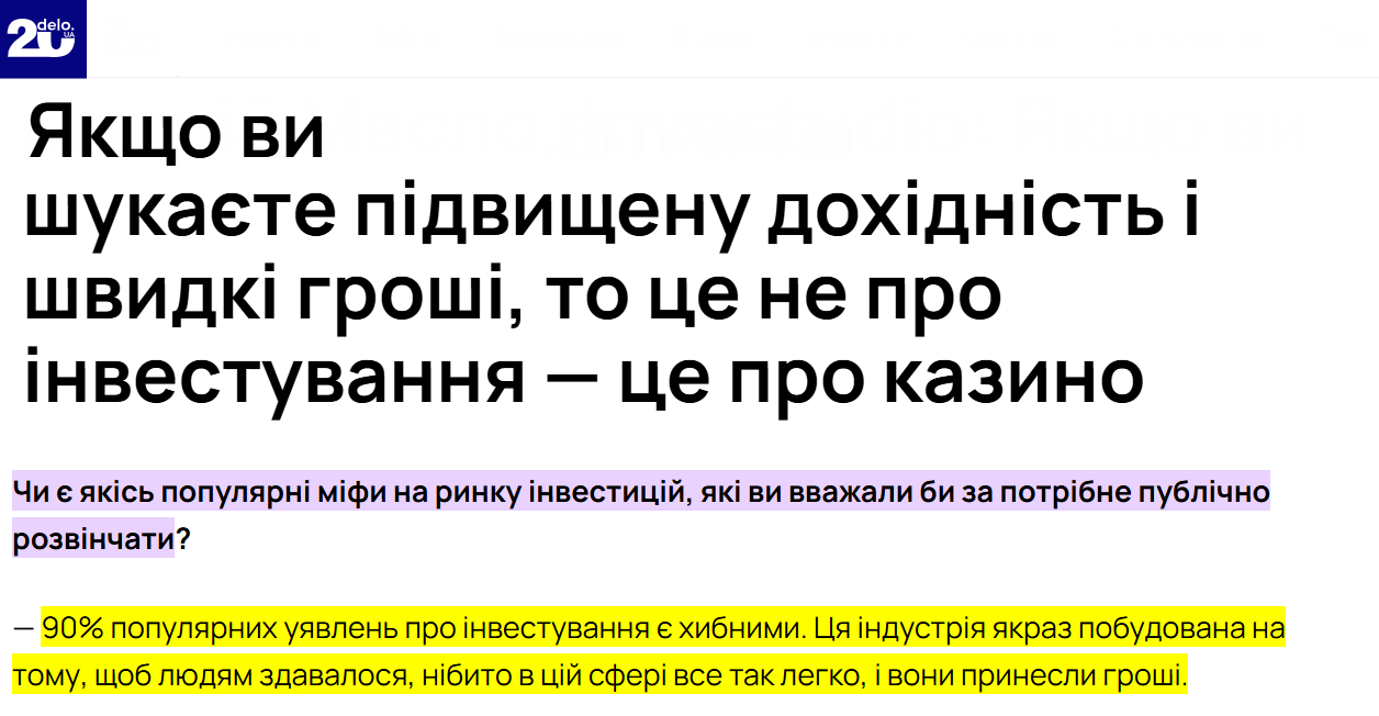 Як кажуть фахівці, і я зі свого досвіду погоджуюсь, переважна більшість усіх уявлень про інвестування є хибними. І це ціль цієї системи, щоби люди не розбиралися, несли гроші в ринок, а ті хто розуміє – забере їх.