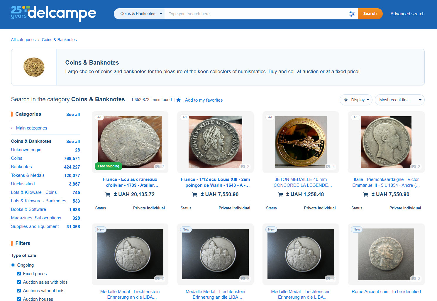 Їх є велика кількість, наприклад, на eBay є розділ Coins & Paper Money, де зосереджена нумізматична продукція. Є спеціалізовані майданчики, наприклад, бельгійський маркетплейс Delcampe, який є доволі популярним в Європі. Тобто, вибір є доволі широкий.