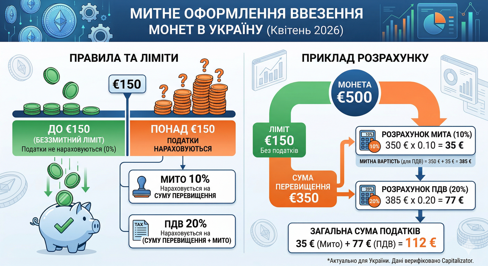 На даний час, в Україні діє поріг безмитного ввезення для посилок фізичним особам. Цей безмитний ліміт становить 150 євро. Якщо вартість монети в посилці не перевищує цю суму, податки і мита не нараховуються. Але якщо перевищується цей ліміт, то нараховується мито 10% та ПДВ 20% на суму перевищення. Ось ви бачите приклад розрахунку податку та мита на монету вартістю 500 євро: