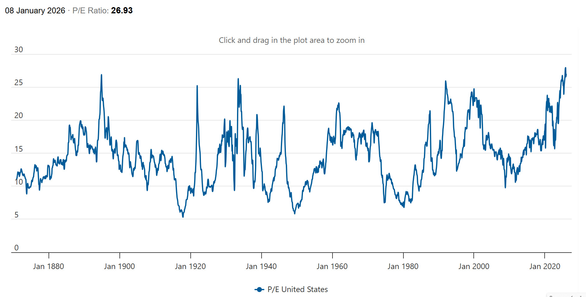Якщо взяти P/E, для широкого ринку – тобто, скільки доларів інвестори готові заплатити за кожен $1 чистого прибутку компанії, то видно, що ринок знаходиться біля історичного максимуму, більше було тільки у листопаді 2025 року.