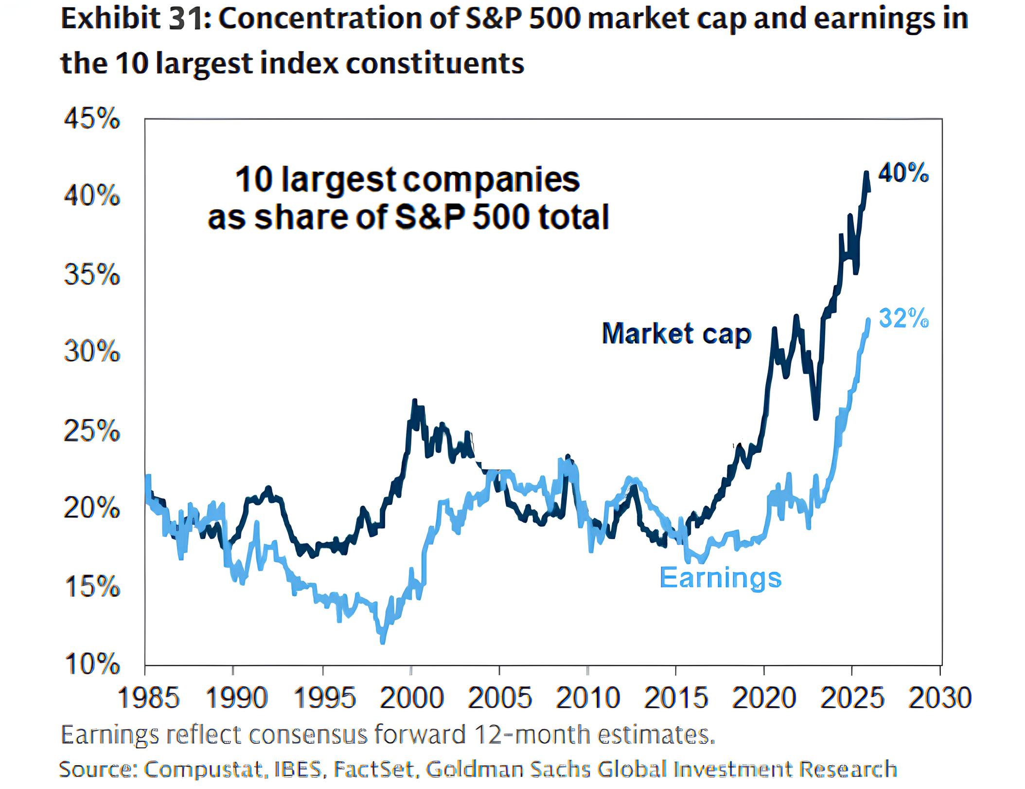 Та це пов’язано із тим, що індекс S&P 500 концентрований у кількох компаніях – 40% ваги індексу знаходиться у 10 компаніях, при чому, більше 20% припадає всього на 3 компанії. І це веде до того, що S&P 500 не є індексом широкого ринку.