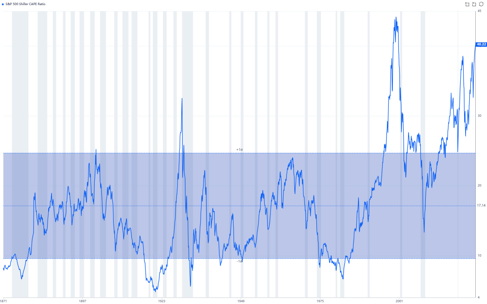 Але, якщо взяти дані по P/E Шиллера по S&P 500, тобто, згладжені 10-річні дані по прибутковості із врахуванням інфляції, то навіть така концентрація не рятує індекс від реальної переоцінки ринку – поточне значення у 40 поступається тільки бульбашці доткомів.