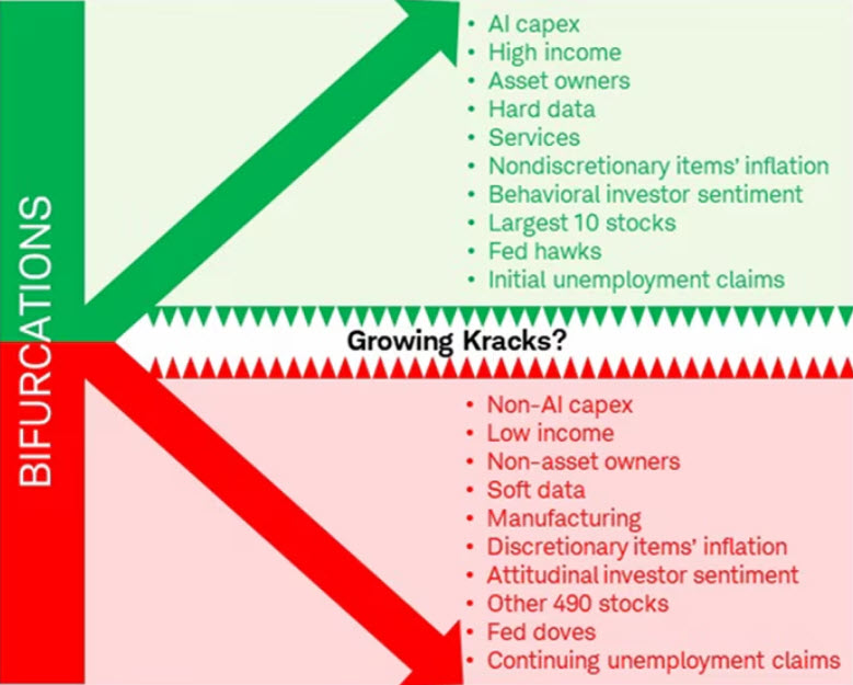 Інша сторона – це стан економіки США. Так, вона ще не у поганому стані, хоча і хорошою назвати важко – вона просто має нестандартний вигляд на даний час. Аналітики показують її як К-подібну, тобто, частина економіки показує певний приріст, а інша частина – показує постійне скорочення. І саме тому, зараз є настільки полярні погляди – одні аналітики прогнозують подальше зростання, а інші – глибоку рецесію. При чому, цей стан економіки не появився зараз, він взяв початок ще у 2022 році, як результат надлишкового стимулювання економіки після пандемії.