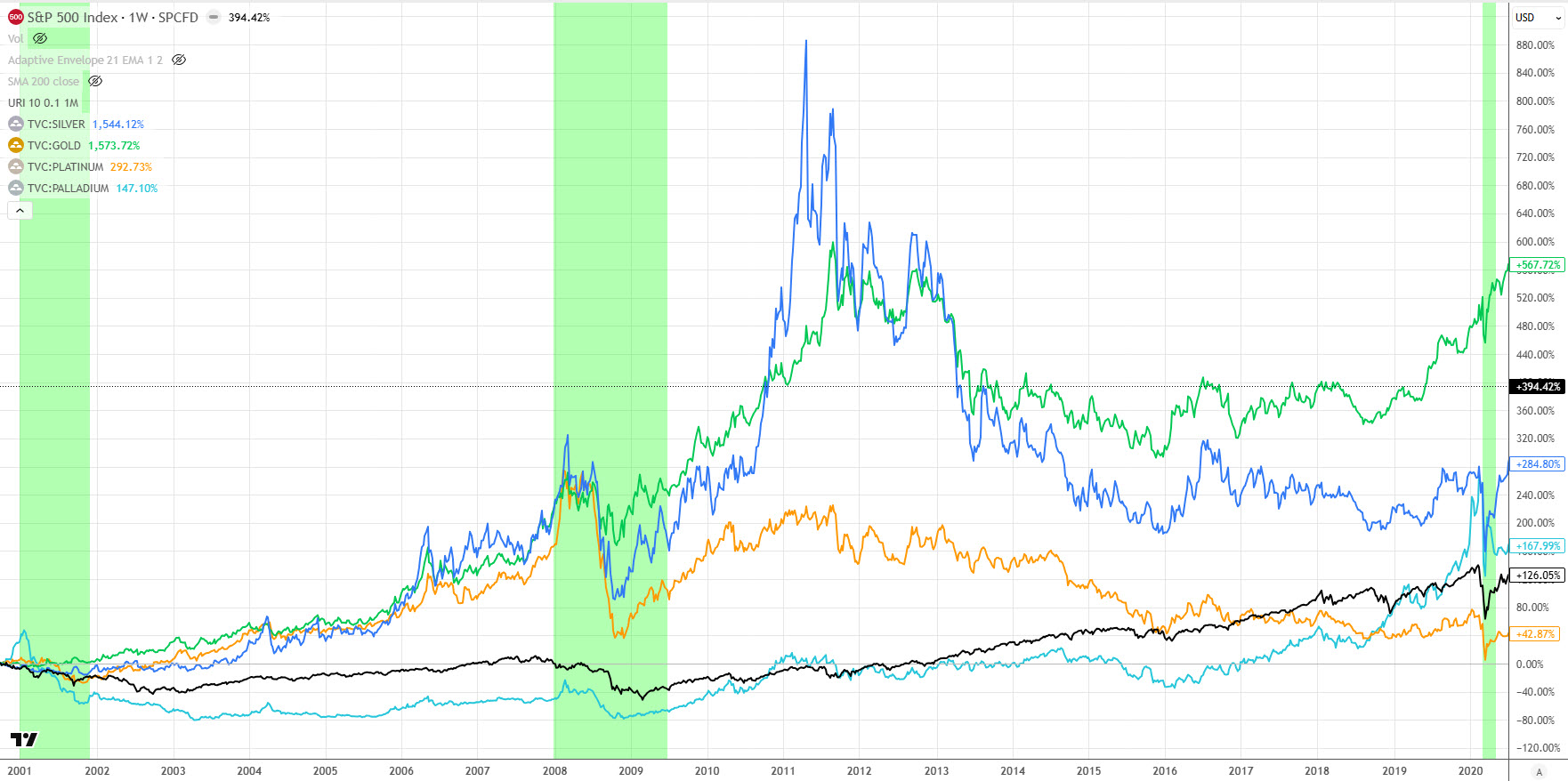 Можна зустріти пояснення, що дорогоцінні метали є захисним активом, тому, на них такий попит в наші часи. Якщо по золоту частково можна прийняти цю думку, то по сріблу, платині чи паладію це узагалі не так, так як це в більшості промислові метали, які мають високу кореляцію із фондовим ринком. І на графіку, який охоплює останні 3 рецесії, ви можете чітко бачити, що усі ці метали, включаючи золото, знижуються у ціні під час рецесій.