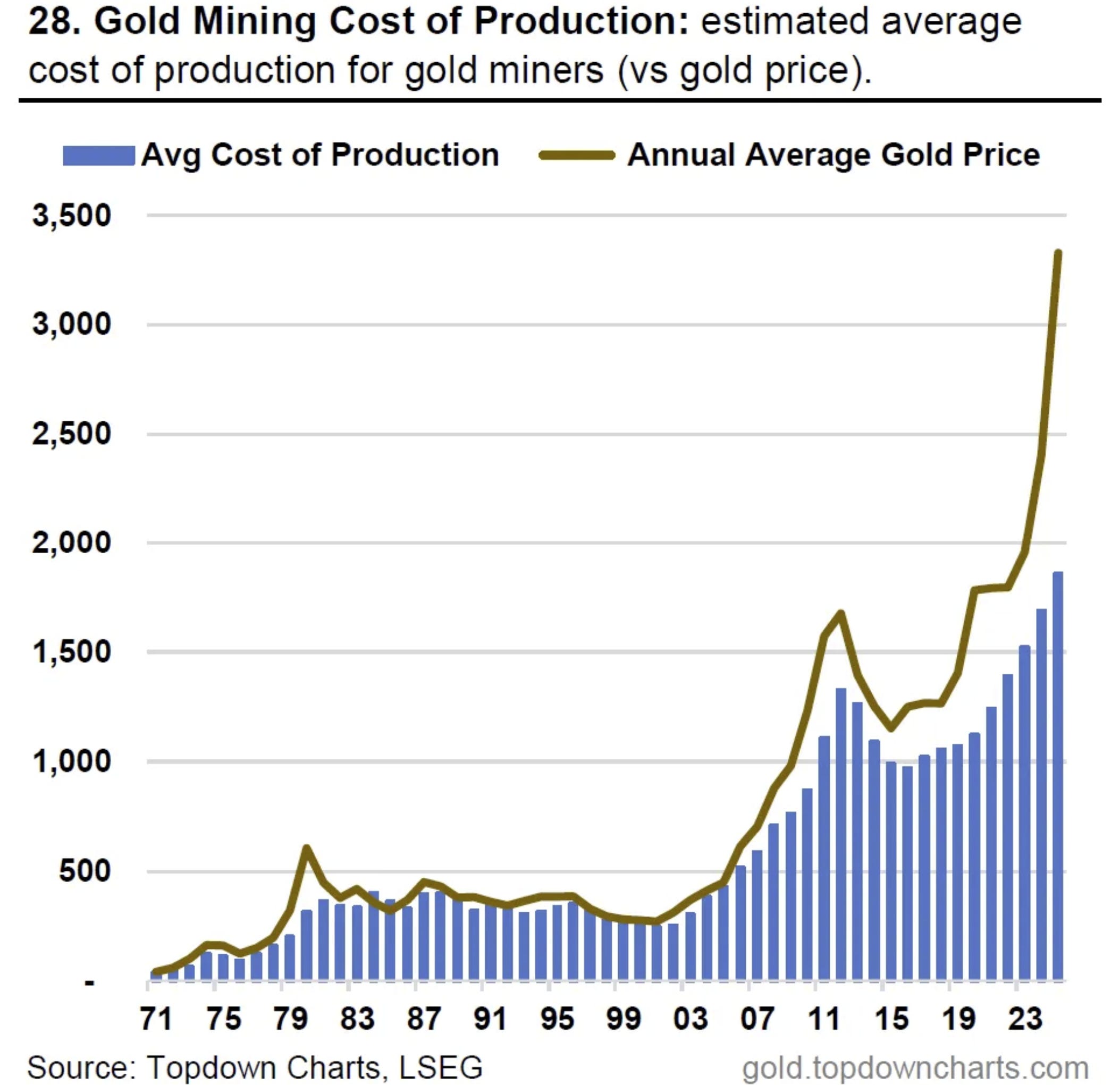 Узагалі по золоту є певне неписане правило, яке підтверджується історією – ціна золота середньо-історично коштує на +-25% дорожче вартості видобутку. І якщо за якихось умов ціна відривалася, то вона завжди із часом поверталася до своєї нормальної вартості.