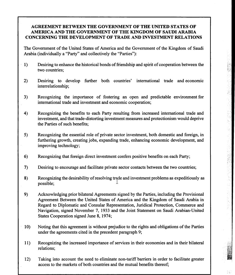 США гарантували забезпечувати військову безпеку королівства, надавати передове озброєння, захищати режим Саудів від зовнішніх та внутрішніх загроз та передавати технології. Взамін, Саудівська Аравія гарантувала продавати всю нафту виключно в доларах США та відмовлятися від будь-яких інших валют, а також, інвестувати надлишки доходів у державні облігації США. І вже до 1975 року інші країни ОПЕК приєдналися до цієї схеми, фактично створивши «нафтовий стандарт».