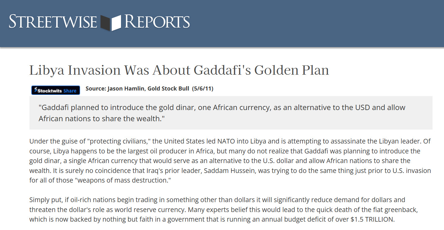 Це тільки із останніх подій, але я нагадаю вам ще дві показові. Ще один диктатор із Лівії – Муаммар Каддафі, також вирішив поборотися із нафтодоларом. Каддафі мав наміри створити єдину панафриканську валюту – Золотий динар.