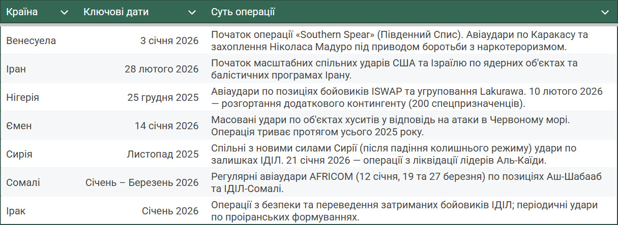 І загалом, за 2025-26 рік, від початку другого терміну Трампа США здійснювали військові операції або удари в 7 країнах, 5 із них (або 71%) є значними виробниками нафти. При тому, що у світі лише близько 20% держав мають значні нафтові ресурси. Тобто, статистична ймовірність того, що це випадковість, становить менше 0,5%.