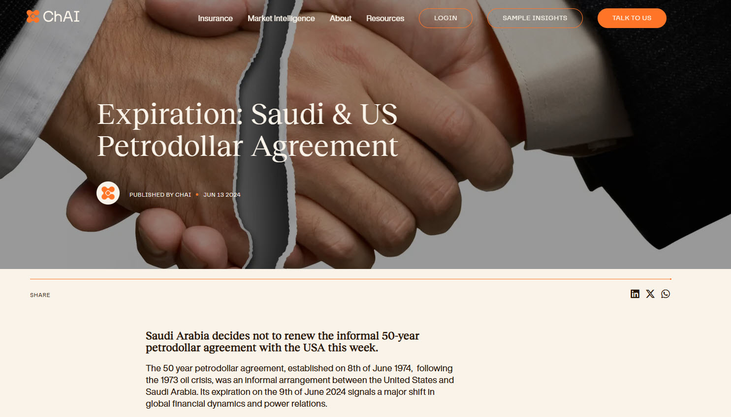 Найважливішою подією останнього десятиліття стало закінчення 50-річної угоди між США та Саудівською Аравією 9 червня 2024 року. Саудівська Аравія вирішила не продовжувати формальне зобов’язання продавати нафту виключно за долари.