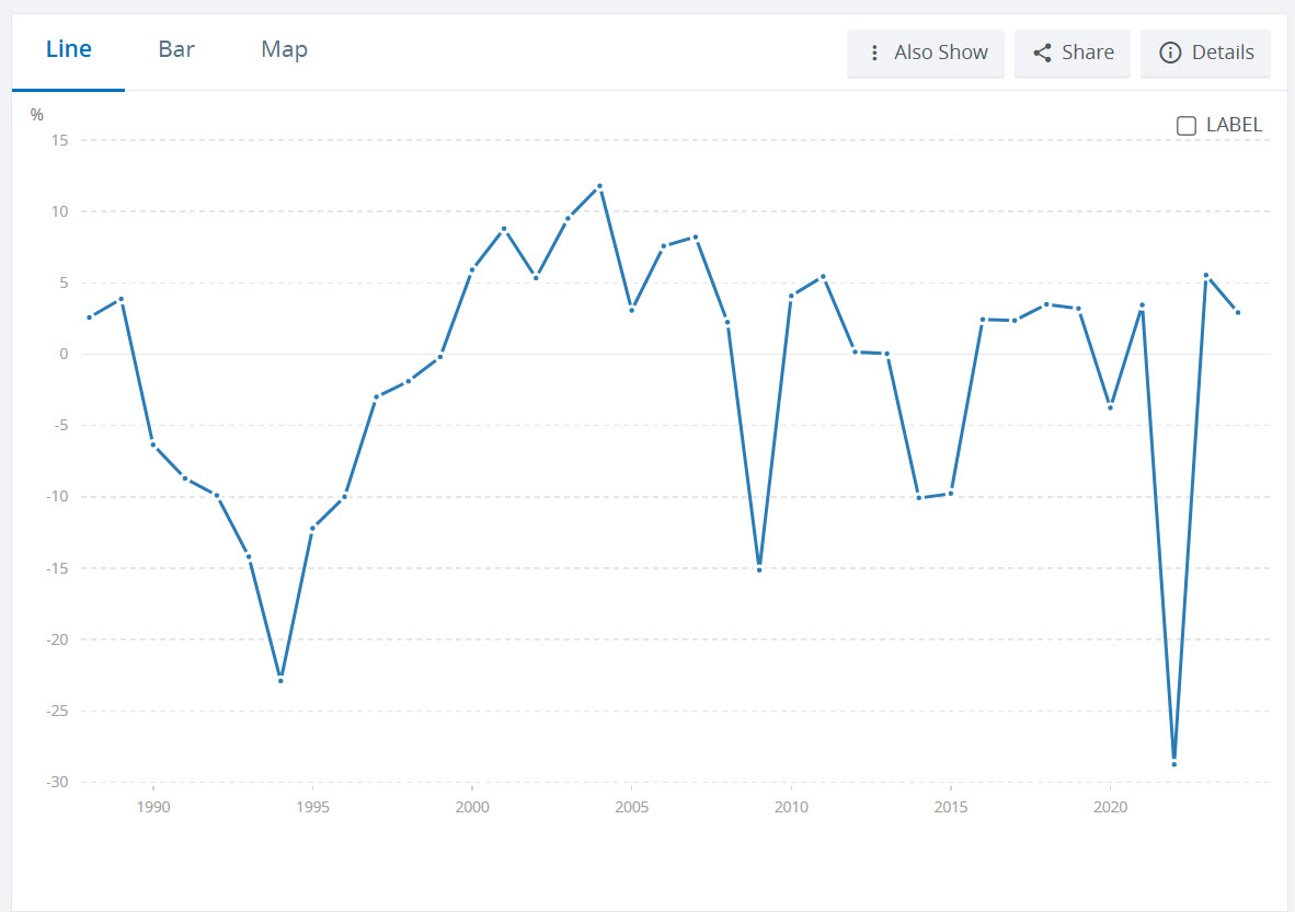 Отож, проблема ВВП-варантів для держави по-перше, у ризику низької бази. Ось як виглядає ВВП України по даним світового банку, і видно, що є періоди від’ємного значення, особливо після повномасштабного вторгнення московитів. І навіть невелике відновлення економіки, буде виглядати як ріст у значенні рік до року. Тобто, реального зростання немає, але статистично виглядає як приріст. А це, відповідно, призводить до вимоги, щоби уряд виплачував величезні % по цим паперам.