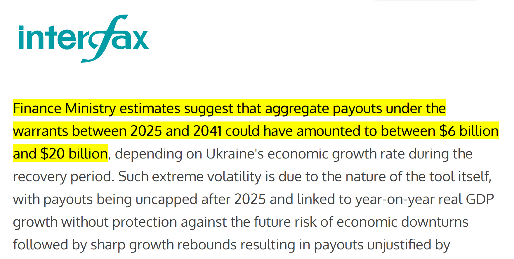 Інша сторона ризику, яку передбачає Міністерство фінансів є повоєнне відновлення. За умови достатнього фінансування ВВП може почати зростати навіть двозначними цифрами, а враховуючи низьку базу – цифри виплат можуть бути астрономічними. За підрахунками, виплати у період до 2041 року могли б сягнути від 6 до 20 мільярдів доларів. А це, в поточних цифрах становить до 10% ВВП України.
