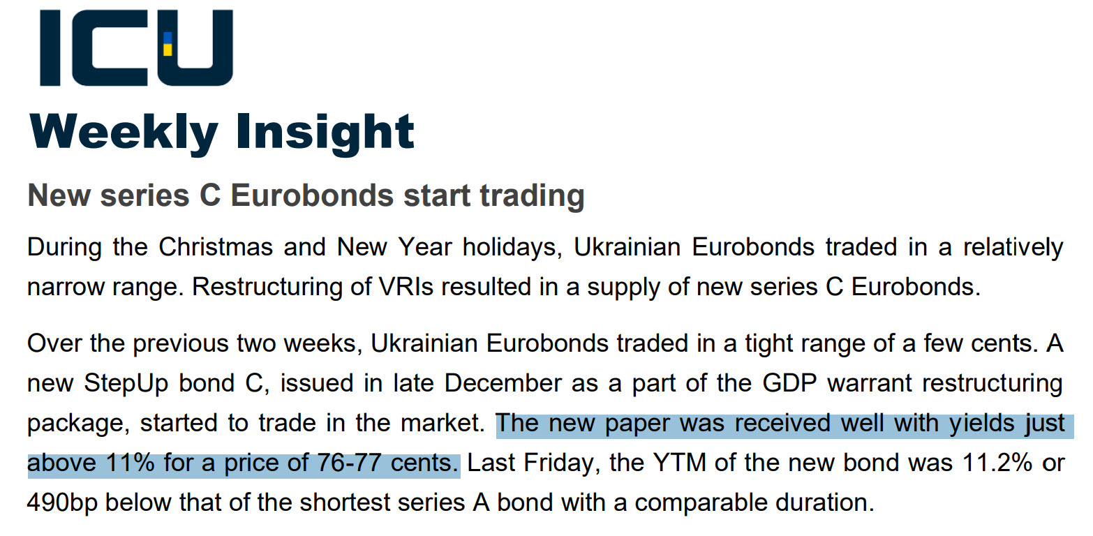 Зараз такі облігації торгуються за 76-77 центів за долар номінальної вартості, тобто, з дисконтом більше 20%. Поточна дохідність до погашення для цих паперів перевищує 11% у доларах США, що є доволі хорошим показником.