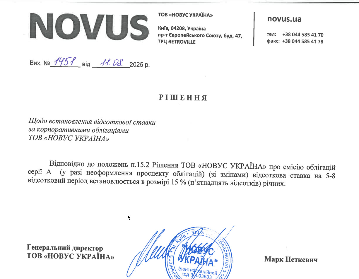 Ще один відомий емітент – це мережа супермаркетів NOVUS. У них не висока ставка – всього 15%, із щоквартальною виплатою відсотків, але їх облігації забезпечені реальною комерційною нерухомістю. Тобто, це знижує кредитний ризик.